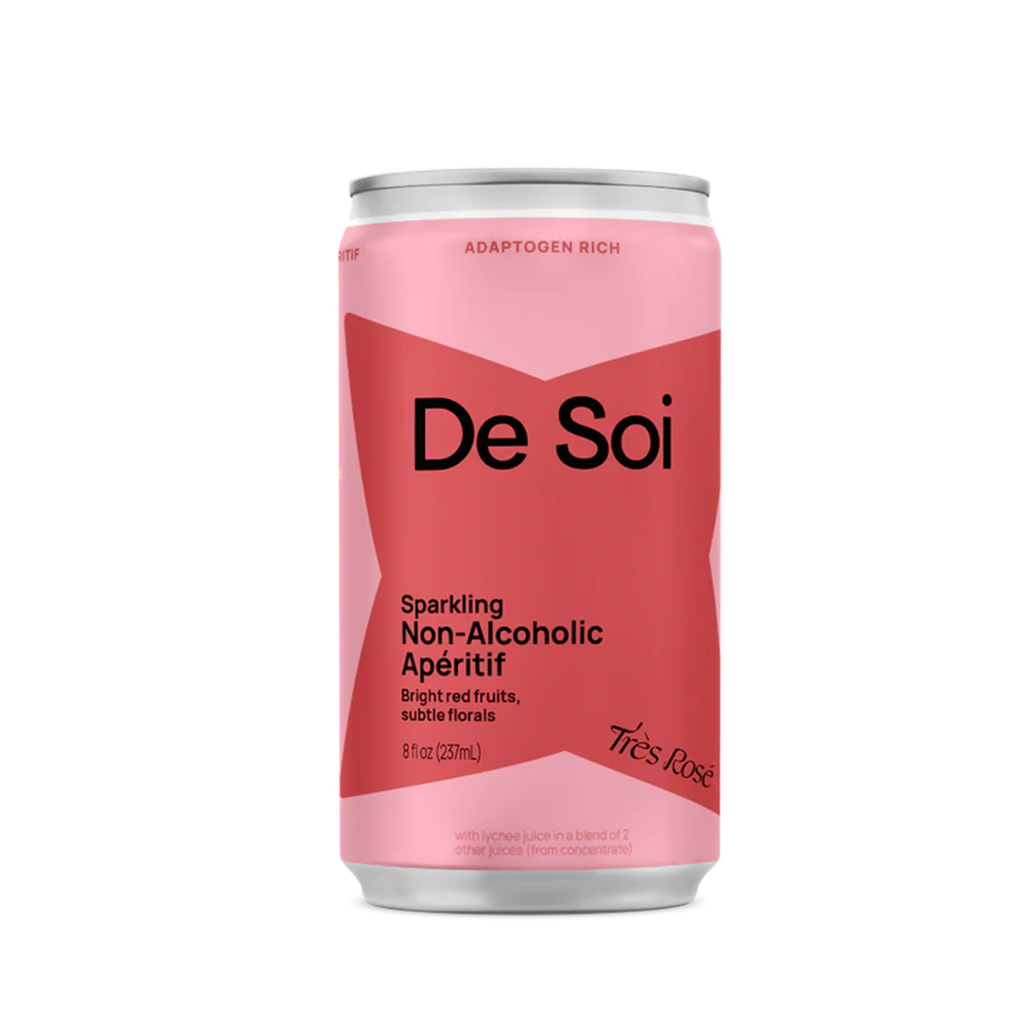 Your fruity, acidic sip. De Soi Très Rosé is a non-alcoholic apéritif backed with feel-good adaptogens. Red fruit and floral palate with tart raspberry and earthy rooibos notes. L-Theanine, Lion's Mane and Reishi mushrooms to ease the mind.