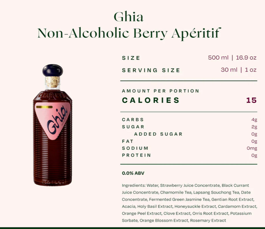 Ghia is a non-alcoholic apéritif packed with only pure, natural extracts. Potent plants. Heady herbals. Blithe botanicals. Everything inside our bottle was picked because of its completely natural ability to soothe and to stimulate. Each glass promises to kick up the energy and calm down the mind.